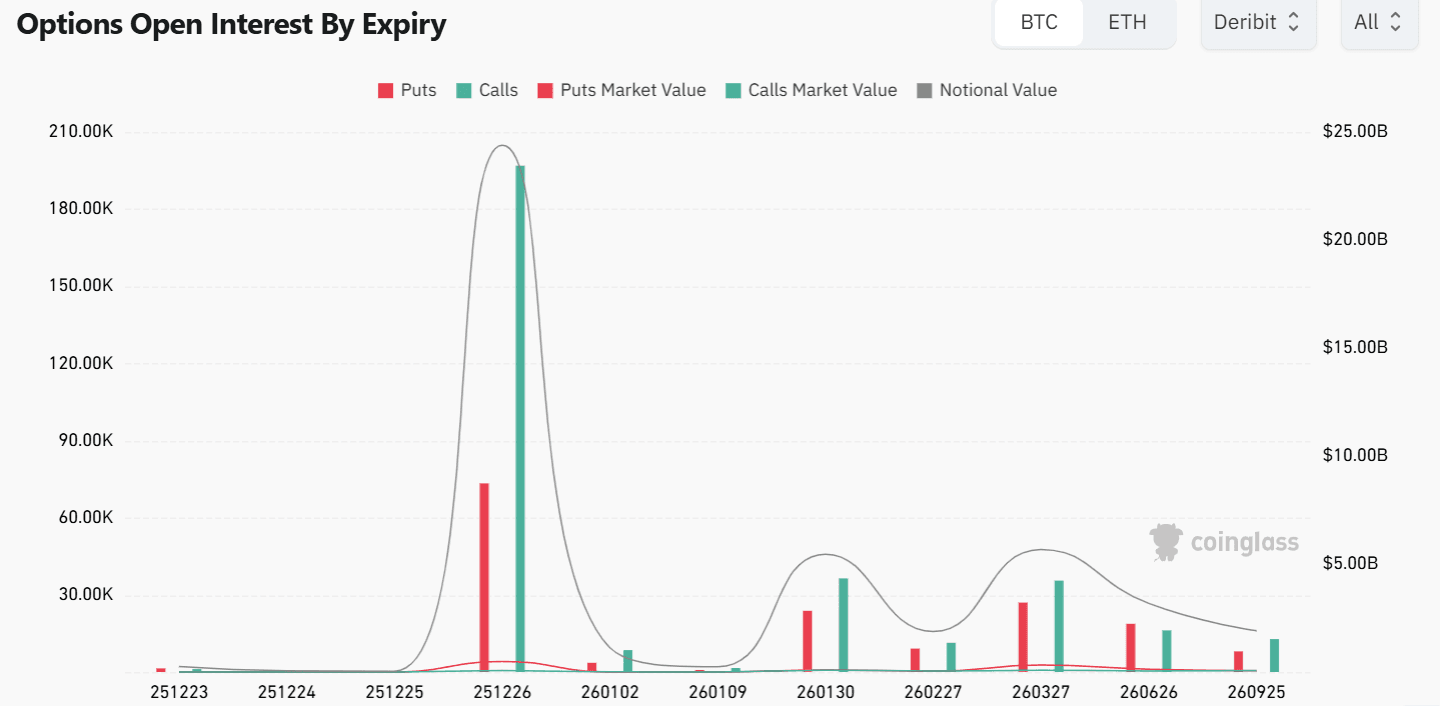 On December 26, 2025, Bitcoin faces its largest options expiration in history, with approximately ~$24 billion in notional value set to settle, primarily on platforms like Deribit. This event, dwarfing previous expiries, has compressed implied volatility to around 44% and clustered heavily around strikes like $100,000, $106,000, and higher. In the lead-up, market makers hedging these positions have amplified whipsaw price action, contributing to recent downside pressure.