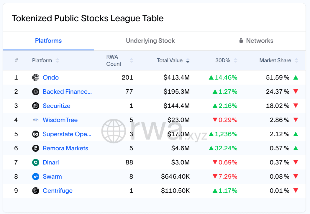 As shown in the current data from rwa.xyz, the sector exhibits high concentration, with the top three providers: Ondo, Backed Finance, and Securitize, controlling over 90% of the total on-chain equity value. Ondo Finance maintains a commanding lead with 51.59% market share and the most expansive product suite at 201 underlying stocks, reflecting a high-velocity 14.46% monthly growth rate. While established players dominate the leaderboard, the 1,236% monthly surge from Superstate Opening Bell signals how rapidly new institutional entrants can capture market share when deploying collateral.