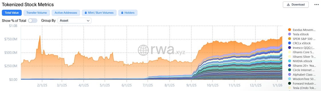 The tokenized equities market entered 2026 with a massive tailwind, having reached a $800M in market capitalization in early January 2026. This represents a 2,500% increase from the $16 million recorded at the start of last year. While this sector still only accounts for less than 5% of the broader $20B billion tokenized RWA market, its trajectory mirrors the early 2020 era of stablecoins, signaling a pending breakout.