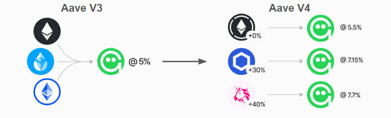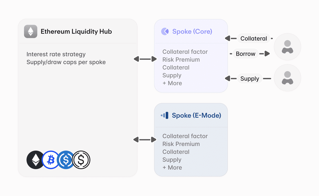 V4 introduces Liquidity Hubs and Spokes as core concepts in the architecture. The Liquidity Hubs act as a unified liquidity layer for multiple Spokes to draw from, enabling access to deeper liquidity. Spokes introduce isolated entry points with specific risk parameter settings adapted to the assets in the spoke.