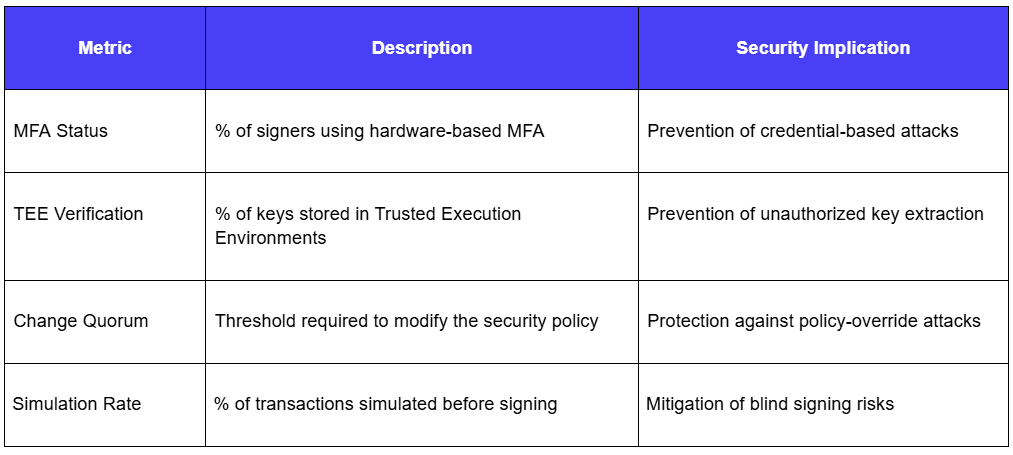 The following table details metrics that could form the basis of a standardized on-chain operational security report.