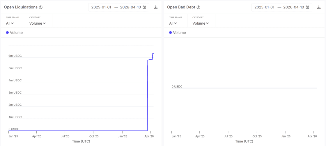 The wstUSR-USDC market provides a clear example for tracking the transition from open liquidations to open bad debt. Following a resolve exploit, an oracle price mismatch prevented liquidators from profitably closing positions despite low health factors. Users can observe open liquidations climbing to roughly $6.33M as of April 2026. As these stagnant positions see their health factors drop below 0.9, they will migrate into the open bad debt category.