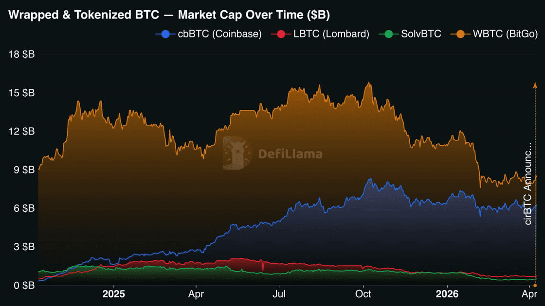 Circle is entering a market that already has clear incumbents. DefiLlama currently shows WBTC at about a $8.4B market cap, while cbBTC is around $6.2B. That means the wrapped BTC category already has meaningful scale, but it is still small relative to Bitcoin itself, which is valued at nearly $1.43T.