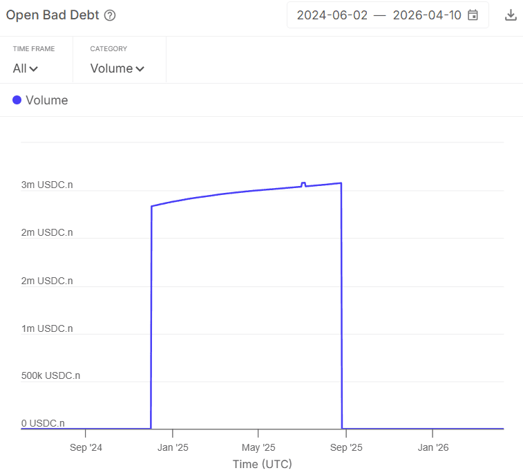 Lending protocols frequently carry small amounts of open bad debt. These dust positions remain after users close out the majority of their loans and often stay on the books because gas costs exceed the profit for liquidators. Risk becomes significant only when the volume shows sustained growth or sudden, sharp increases. For institutional lenders, these spikes suggest that the collateral is distressed and liquidators are actively avoiding the market.