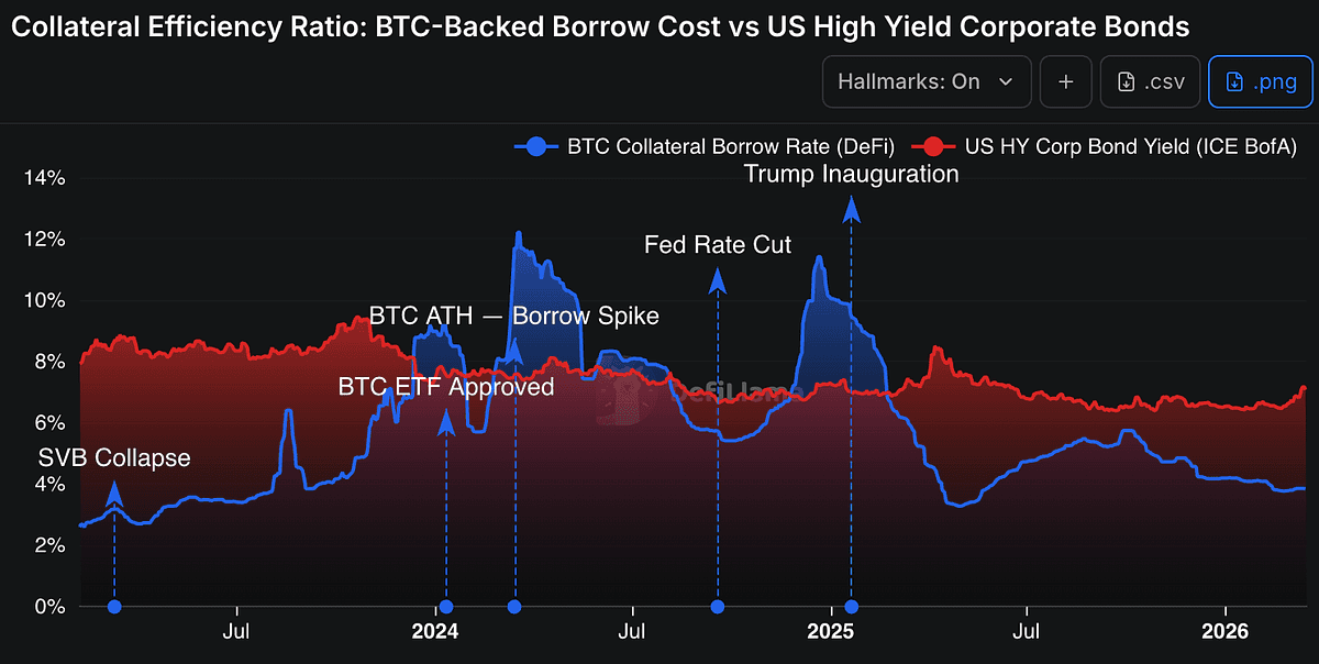 The chart clearly shows that BTC collateralized borrowing rates are consistently trending below US high-yield corporate bond yields, even though BTC remains a more volatile asset. While there are occasional spikes during periods of market stress, reflecting short-term liquidity demand and volatility shocks, the overall cost of borrowing against BTC remains structurally lower. This suggests that the market is increasingly valuing BTC’s deep liquidity and global trading nature over its volatility, allowing it to function as efficient collateral. JPMorgan’s activation reinforces the trend by enabling institutions to unlock USD liquidity against BTC and ETH at lower rates, improving capital efficiency while accepting manageable volatility driven fluctuations.