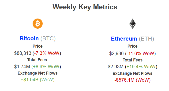 Bitcoin: Fees expanded +8.6% to $1.74M despite the -7.3% price contraction. This negative correlation suggests network activity was driven by “rush-to-exit” transfers to exchanges rather than healthy ecosystem utilization, increasing the cost of block space during the sell-off.