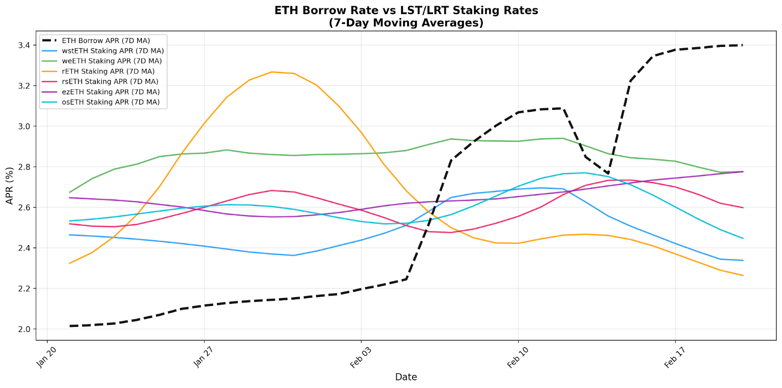 The provided chart illustrates the divergence between borrowing costs and protocol yields throughout the first quarter of 2026. The black dashed line, representing the 7-day moving average of the debt-weighted ETH borrow rate, shows a steady incline from approximately 2.0% in late January. By mid-February, this rate crossed above the yields of all sampled LSTs and LRTs (indicated by the colored lines), creating a persistent negative spread. This trend reflects a structural maturation of the staking ecosystem, where increased validator participation dilutes yields while high utilization in lending markets drives up capital costs.