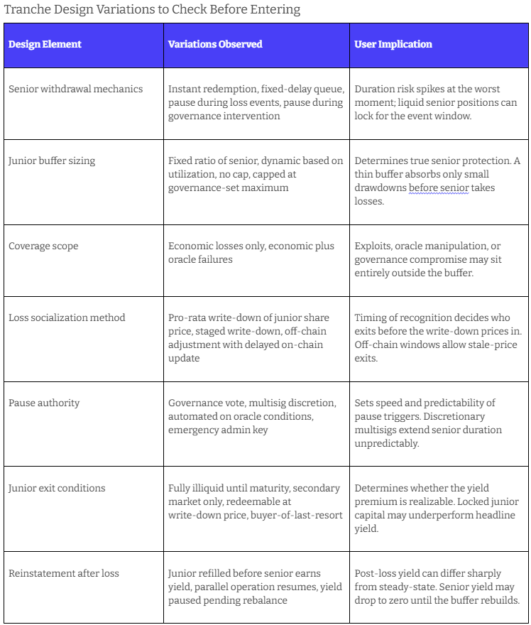 None of this argues against tranched products. Differentiating risk profiles on a shared collateral pool is a clear improvement over monolithic yield vaults and opens assets to users who would otherwise hold neither the unlevered nor the leveraged version. Tranching changes the shape of risk, it does not eliminate it, and that shape is defined by design choices that differ materially between protocols. Before entering a junior position, confirm the drawdown scenarios that trigger a write-down and whether it is pro-rata or staged. Before entering a senior position, confirm the pause and redemption conditions and the exact coverage scope of the buffer.