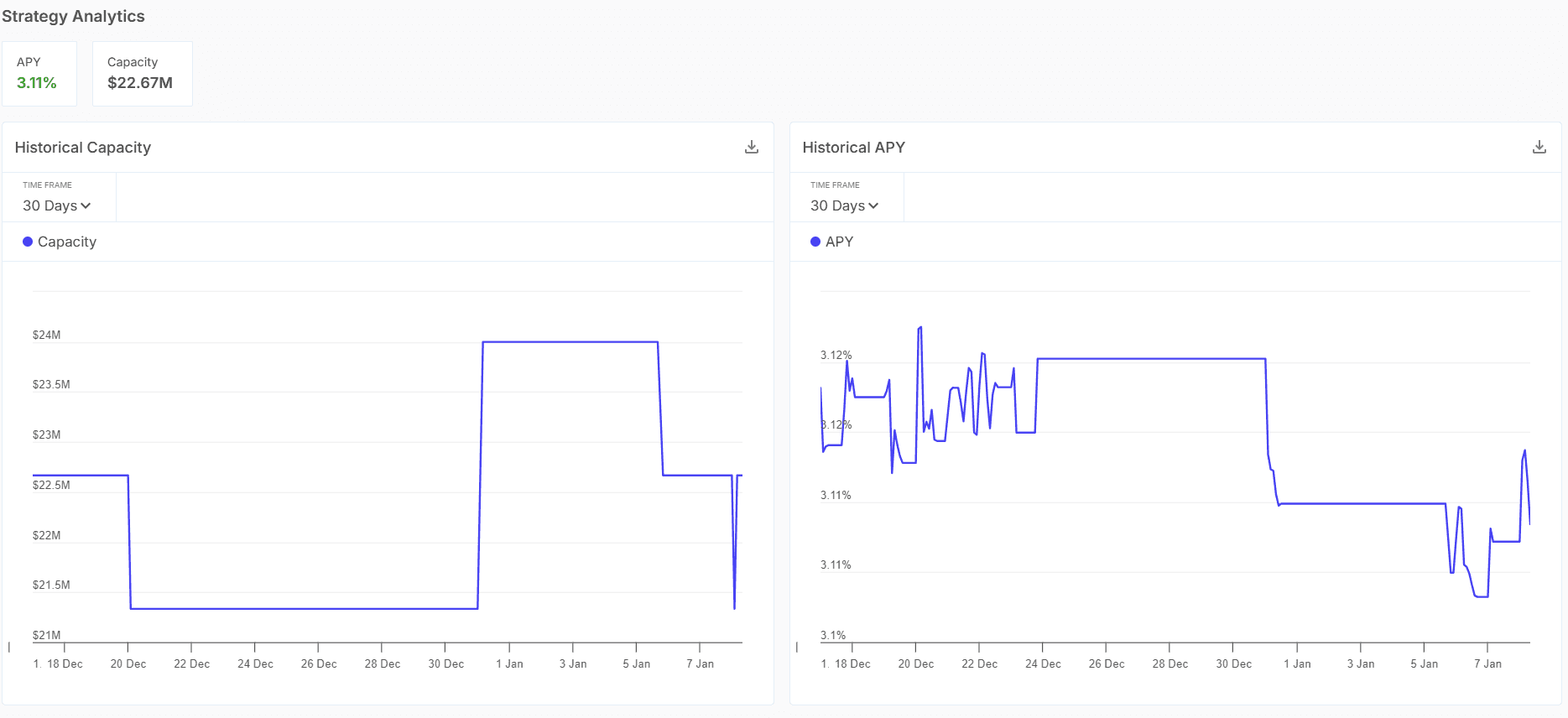 Strategy pages with analytics: Individual strategies show historical APY, historical capacity, and concise descriptions pairing performance with operational reality.